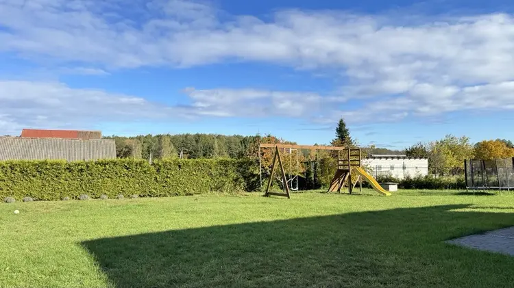 Участок ровный, крайний, с одной стороны лес, с другой-поле, огорожен, высажены плодовые деревья, имеется зона отдыха для детей, обустроенная горкой и батутом, также теплица и лотки для посадки овощей.