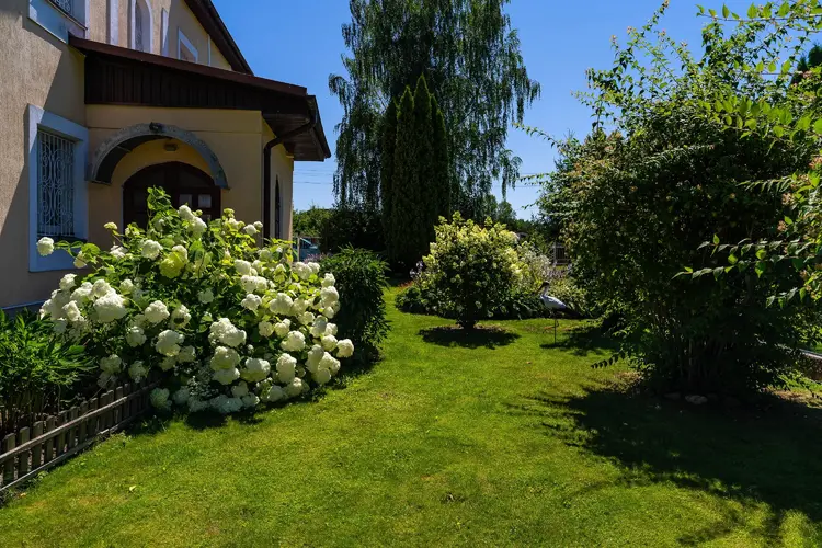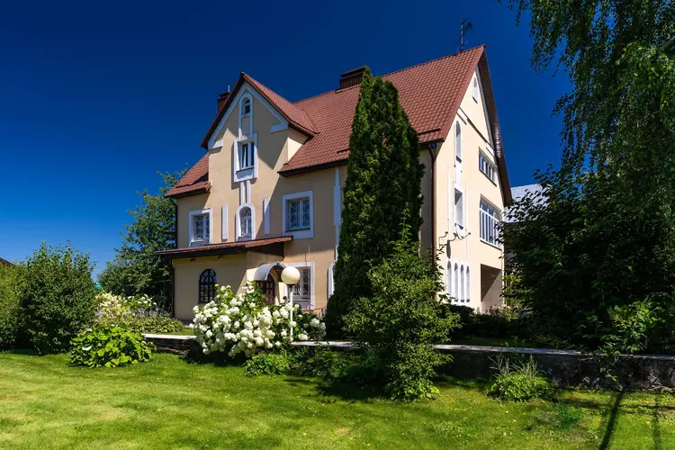 Благоустроенный участок перед домом, а задний двор словно растворяется в зелени и тени деревьев. На территории обустроен собственный пруд с рыбой и даже французскими лягушками. Включает в себя сад, огород и баню. Внутреннее убранство выдержано в классическом стиле, отличающемся сдержанностью и мягкой палитрой. Просторные комнаты, высокие потолки создают ощущение свободы.