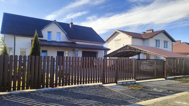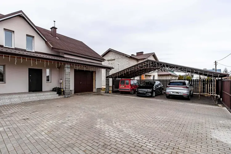 Участок 15 соток, ровный, огорожен со всех сторон. Откатные ворота на пульте управления. Перед домом уложена тротуарная плитка, навес для стоянки трех автомобилей.