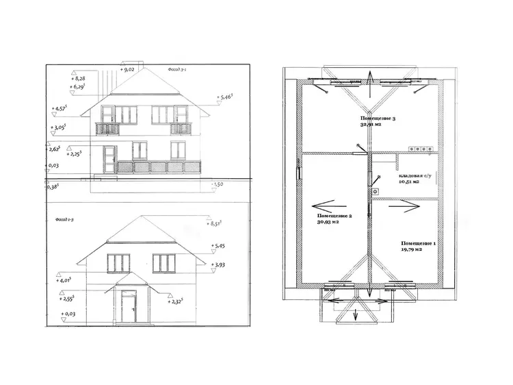 2 этажа, второй полумансардный, межэтажное перекрытие: дерево 150х60 мм, шаг 450 мм, расчетная нагрузка 400кг/кв.м. Перегородок на 2м этаже нет - полная свобода. Окон в крыше нет.