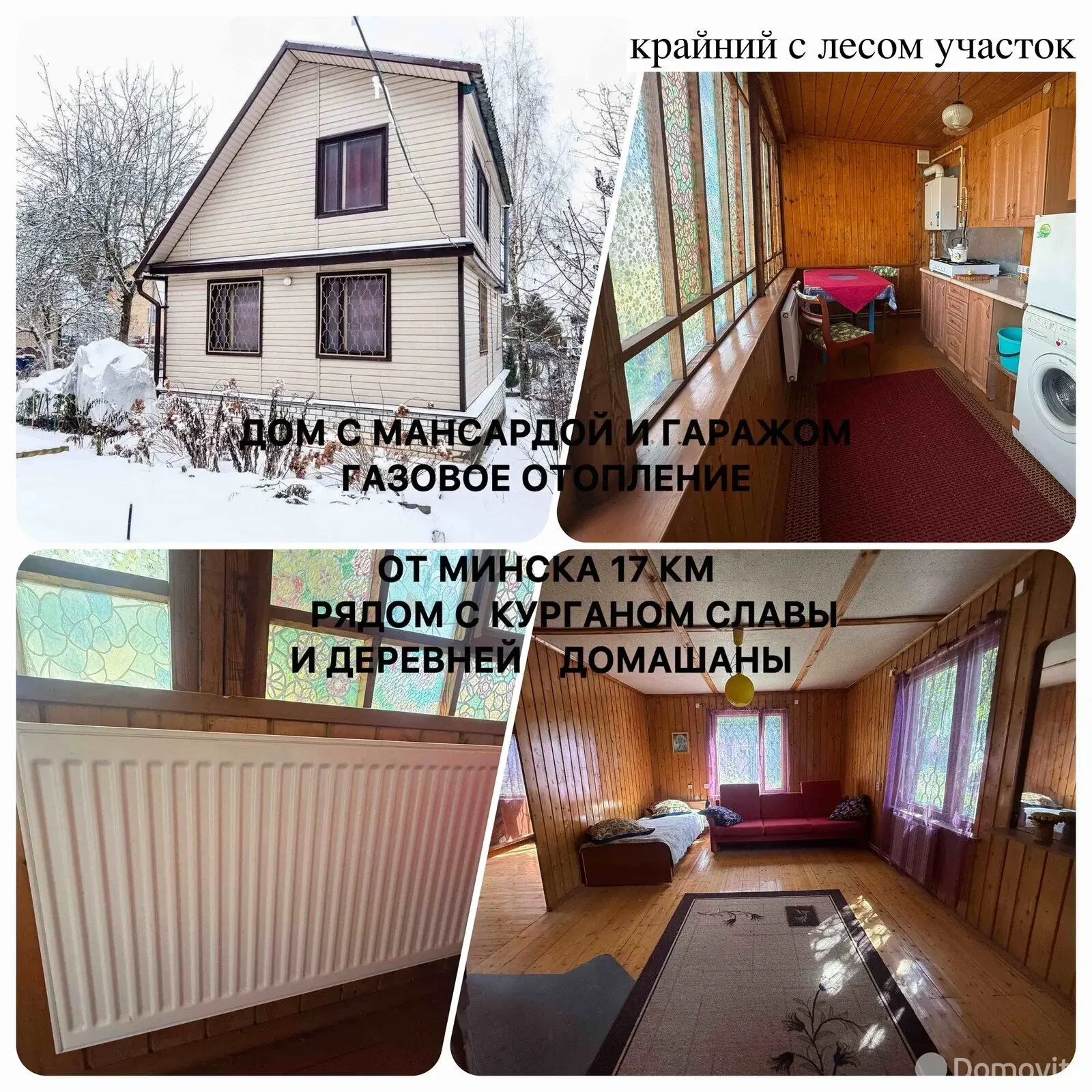 Всего в 13 минутах от Минска и 5 минутах ходьбы от деревни «Домашаны» в газифицированном садоводческом товариществе «Криница-Зеленстрой» продается ухоженный двухэтажный дом с отоплением на газу. Дом с гаражом, на крайнем участке со своим выходом к лесу. Удобные подъездные пути по Московскому шоссе на авто (без длинных грунтовых дорог), всего в 17 км от выезда из Минска по асфальтированной трассе, рядом с Курганом Славы.