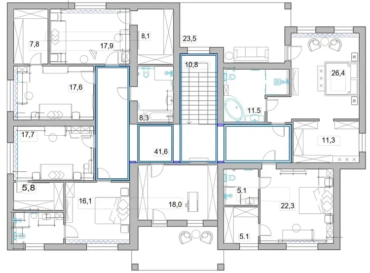 • Второй этаж (потолки 3,0 м): Просторная приватная зона. 6 спален: 3 детских с гардеробными и санузлами, 2 гостевых и мастер-спальня с отдельной гардеробной и санузлом. Возможность легко перепланировать под нужды семьи.