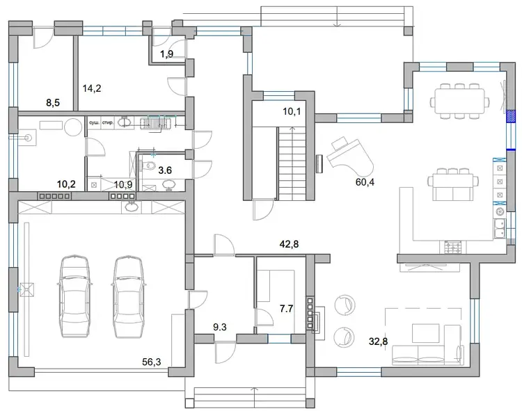 • Первый этаж (потолки 3,75 м): Грандиозное пространство для жизни и приёмов. Просторная кухня-столовая, светлая гостиная, гараж на 2 автомобиля, постирочная. Ценность объекта: готовая зона СПА с бассейном, сауной, тренажерным залом и комнатой отдыха, выходящая в собственную крытую беседку.