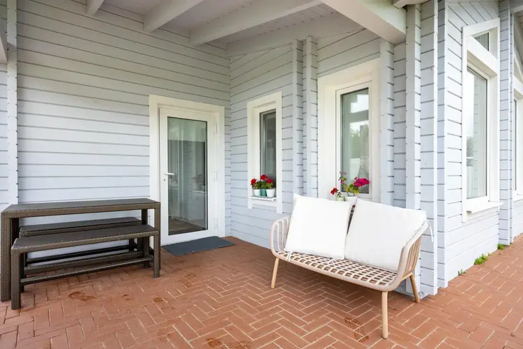 На полу плитка и ламинат. Теплый пол на 1 этаже и в ванной. Пол и стены в котельной оштукатурены и плитка на полу. Входная дверь стеклянная в пол с выходом на террасу.