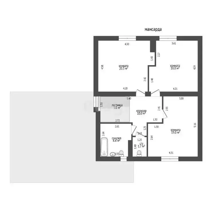 На втором этаже застройки находится: 3 изолированные комнаты, ванная комната, санузел.