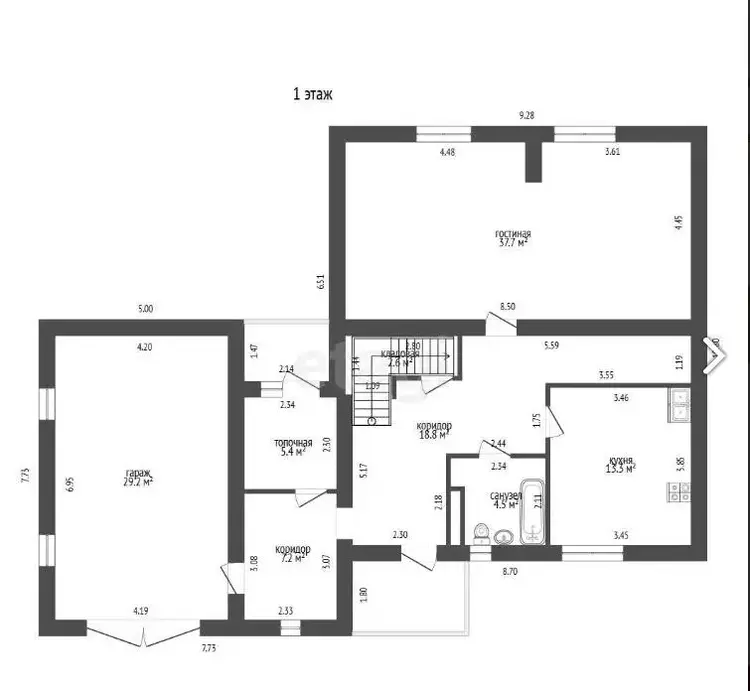 Общая площадь дома 199,3 м2, жилая 95 м2, гараж 29,2 м2.