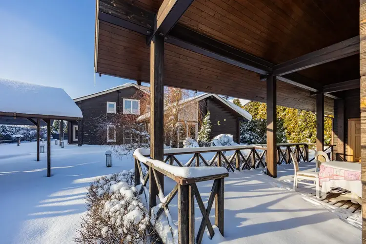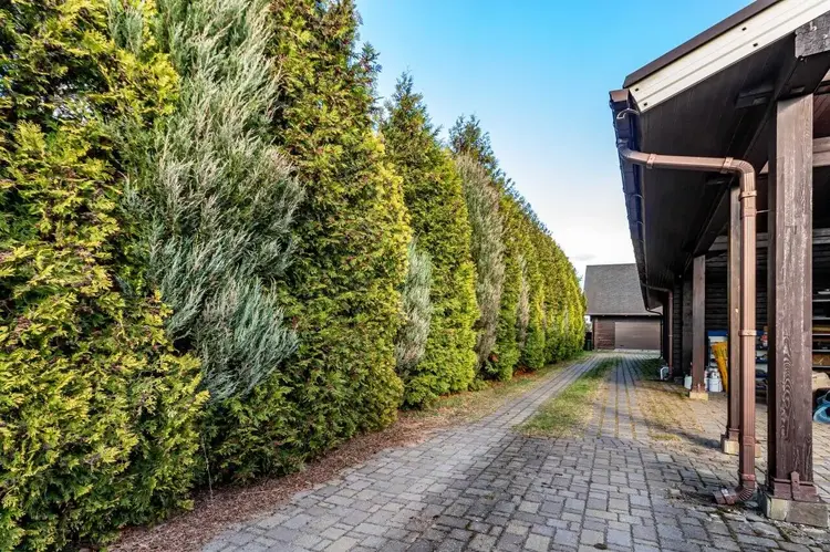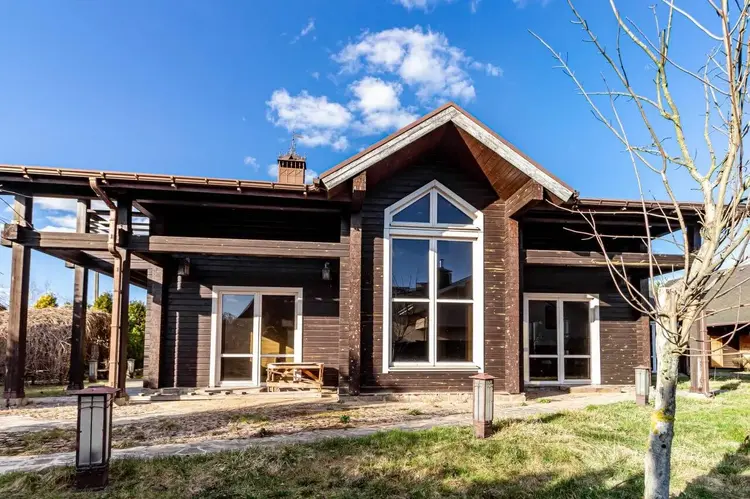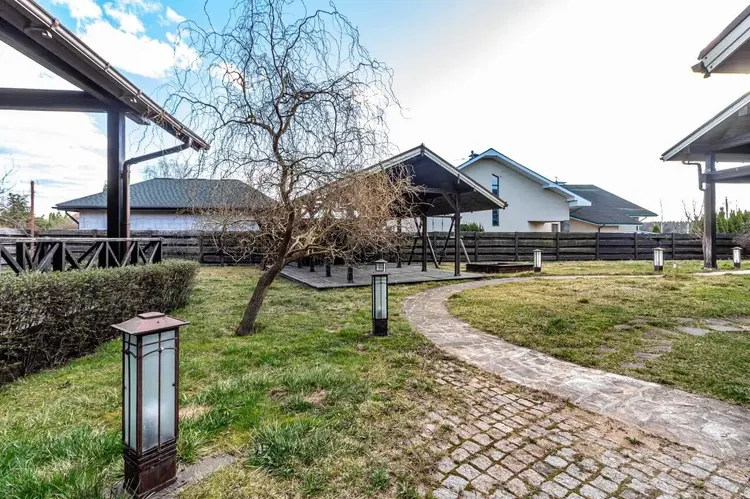 Дома выполнены из клееного бруса премиум-класса от Wooden House. Натуральная фактура дерева с искусственно состареными балками (техника браширования) и гибкой черепицей, создают образ аутентичного европейского поместья. По всему дому установлены панорамные 3х камерные стеклопакеты. Участок окружён забором из гранита, ковки и дерева. Установлены автоматические ворота. Ландшафтный дизайн дополнен дизайнерским фонтаном, зоной барбекю с мраморной столешницей и водоснабжением. Газон защищён от кротов, автополив TORO обеспечивает идеальный уход, а ливневая система с элементами ковки решает проблему отвода воды.