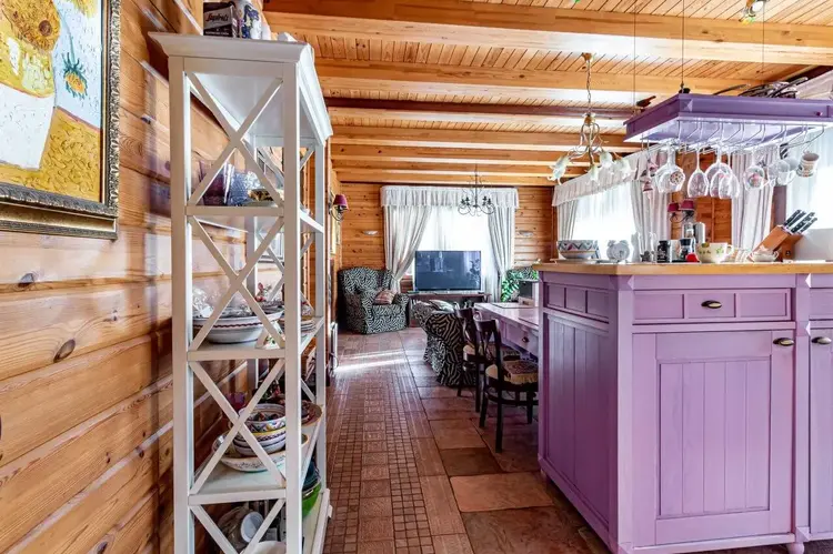 Гостевой дом включает в себя два этажа, на первом из которых расположена гостиная со встроенной кухней, санузел, гараж и сауна. На втором этаже расположены две комнаты со своими гардеробными. Санузел с душевой.