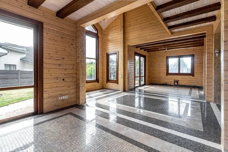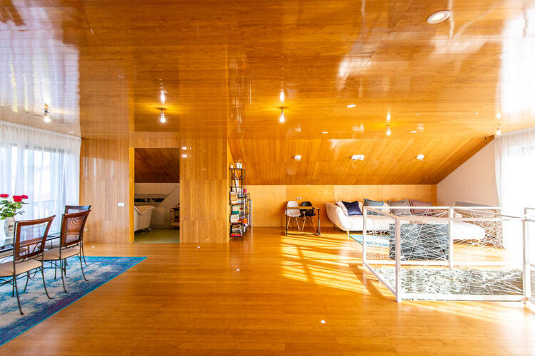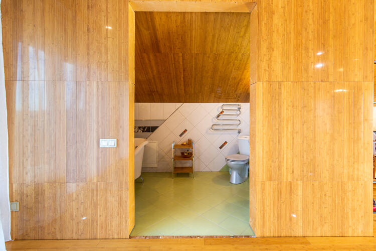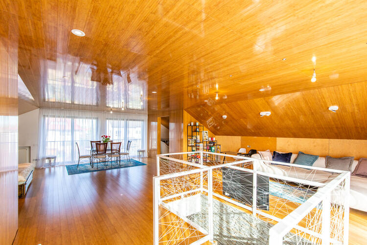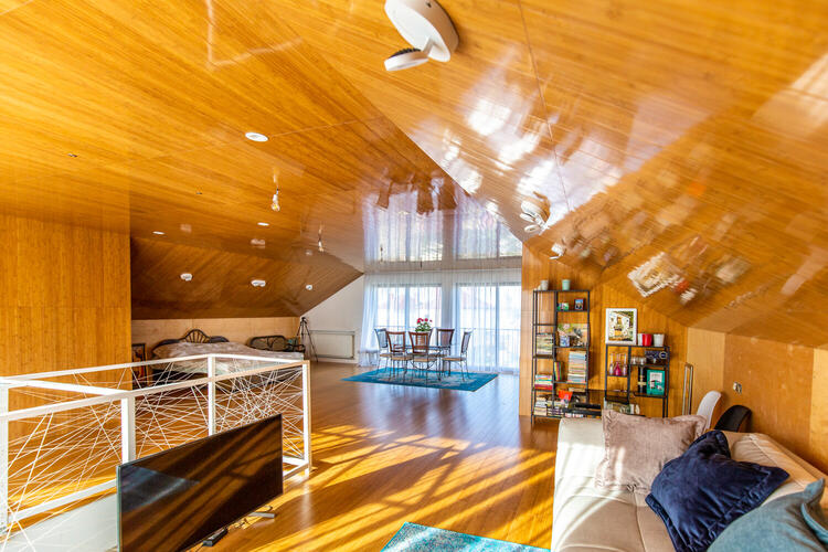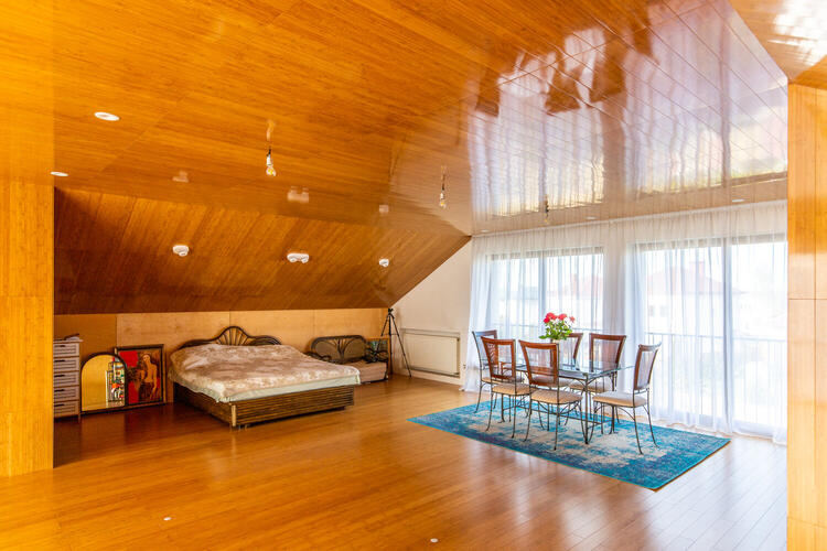 Полностью готов к жизни и оборудован всем необходимым просторный мансардный этаж. Внутренняя отделка мансардного этажа – высококачественный массив бамбука (стены, полы и даже потолки), итальянская коллекционная плитка и сантехника в санузле.
