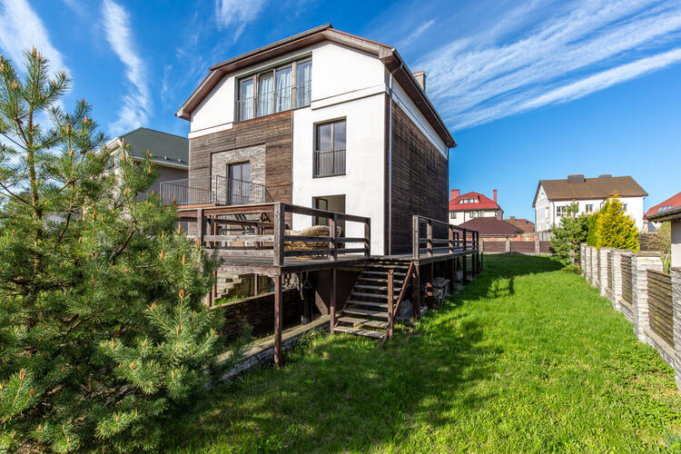 Современный проект, на каждом жилом этаже предусмотрен санузел. Высокие потолки и европейские окна в пол наполняют дом лёгкостью и светом. В строительстве и отделке использованы только экологически чистые материалы.