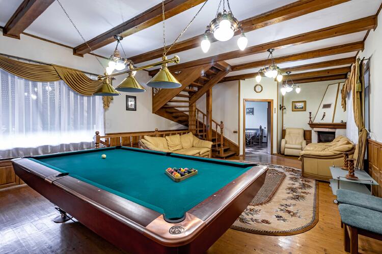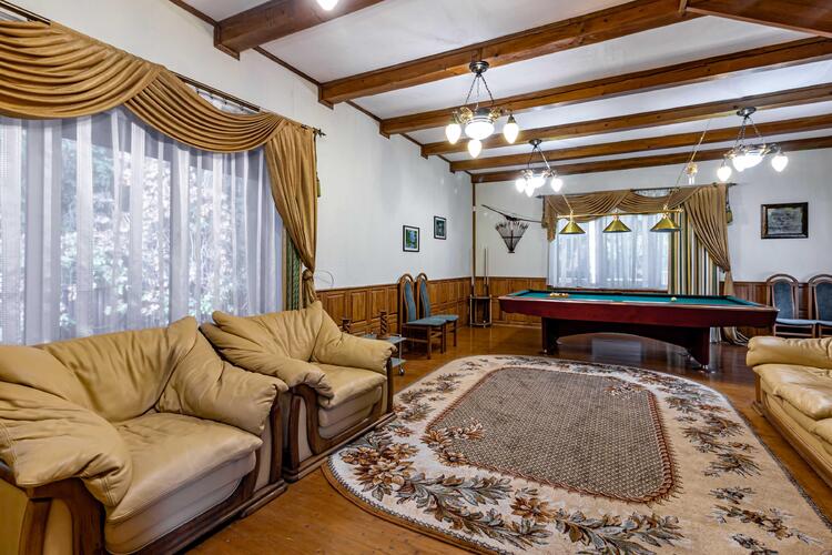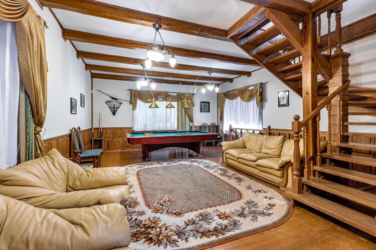 - просторная, светлая гостиная 37,9 м2 c натуральным камином на дровах, с бильярдом;