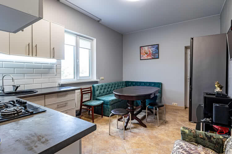 На первом этаже дома расположены просторная кухня - 14,1кв.м, гостиная - 19,5кв.м, ванная комната и котельная, на мансардном этаже - две жилые комнаты, душевая и холл. Кухня и ванные комнаты укомплектованы современным кухонным и сантехническим оборудованием, а все жилые помещения - добротной мебелью. Первый этаж дома оборудован теплыми полами. Собственная скважина, автономная канализация (септик), отопление на газовом котле, оптоволокно.