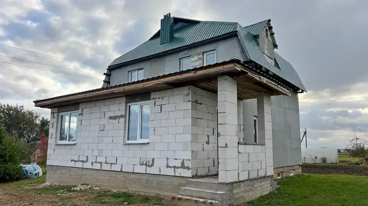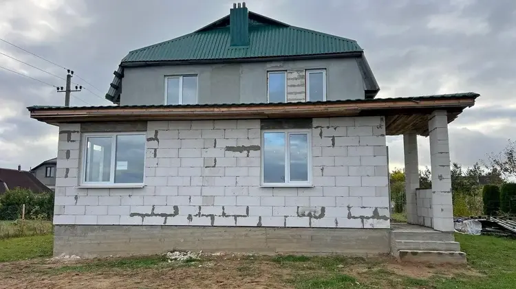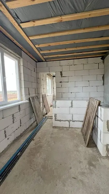 Стены - блок газосиликатный, наружная штукатурка, перекрытие по деревянным балкам, фундамент ленточный, кровля – металлочерепица, утепление кровли 15см по перекрытию.