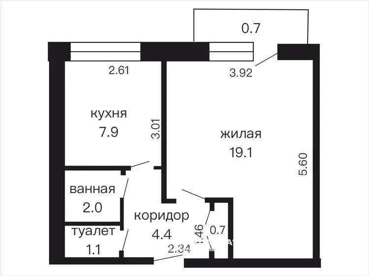 - Общая площадь: 35.2. Жилая площадь: 19.1. Площадь кухни: 7.9