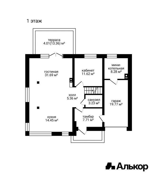 Предусмотрен выход из прихожей в гараж, установлены подъемные ворота на пульте.