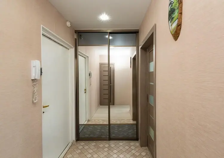 В прихожей сделана гардеробная, которая удачно сочетает функциональность и эстетику, создавая уютное и удобное пространство для встречи гостей и хранения верхней одежды и обуви.