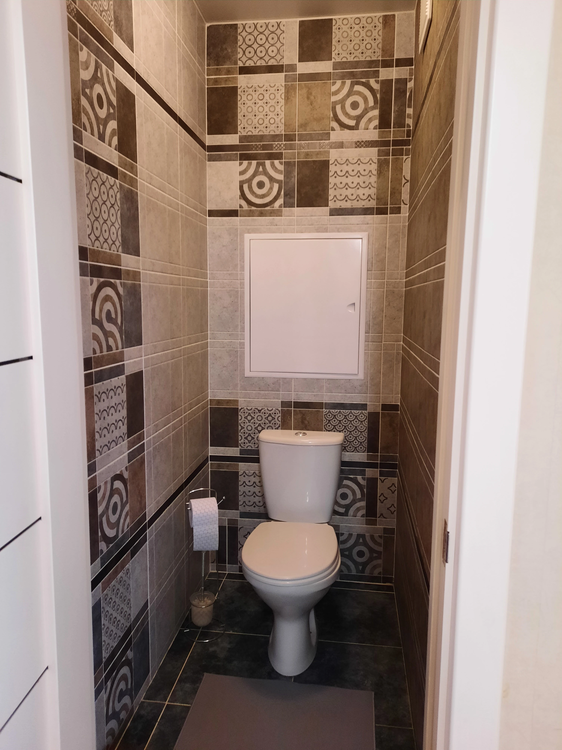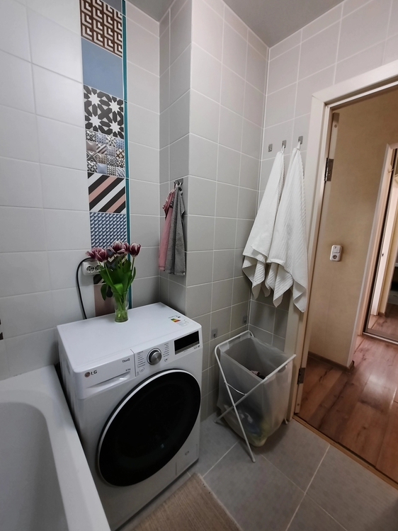ламинат в жилой зоне, в ванной комнате — плитка