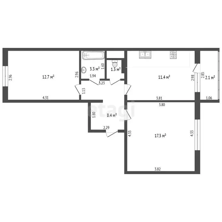 - Общая площадь квартиры 56,5 кв.м. Две жилые комнаты - 12,7 кв.м. и 17,3 кв.м., просторная кухня 11,4 кв.м.