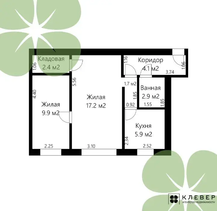 · общая площадь жилых комнат 27,1м2 (17,2 м2 и 9,9 м2)