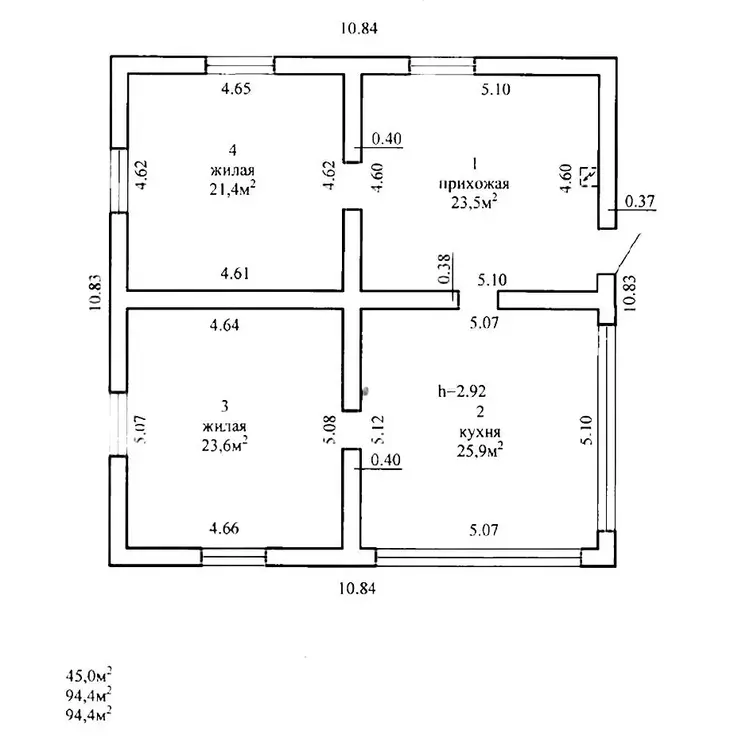 Общая площадь 94.4м2, жилая площадь дома 45м2. Высота потолков 2,92м. В доме 2 жилые комнаты, большая кухня-гостиная 25.9м2, в четвертом помещении планировалось функциональное размещение санузла, технической комнаты и прихожей.