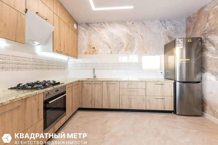 Установлена встроенная кухня с техникой европейских производителей: варочная поверхность, духовой шкаф, посудомоечная машина, вытяжка. Столешница —натуральный мрамор. Встроенные шкафы решают вопрос хранения.