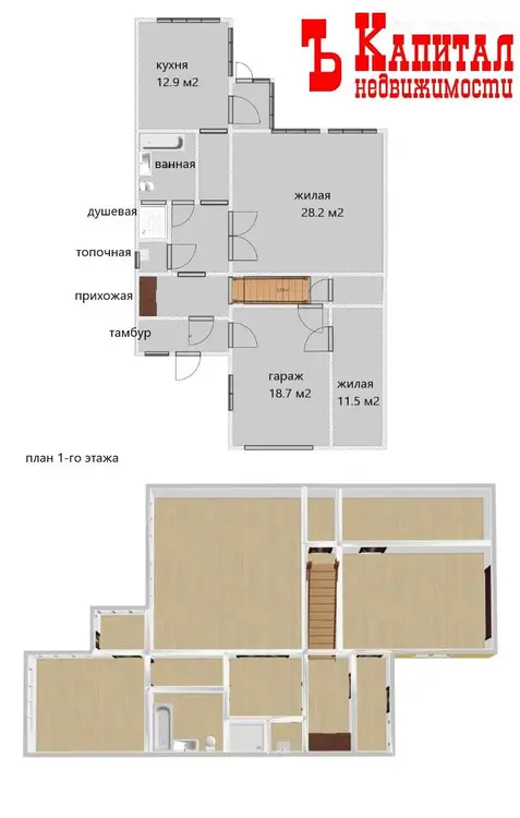 На первом этаже дома расположена гостиная 28.2 м2, просторная кухня 12.9 м2 с выходом во внутренний двор. Совмещённый санузел вместил в себя ванную и душевую. На втором этаже две жилые комнаты 15,0 м2 и 16.1 м2 . В одной из спален уютная лоджия. Так -же имеется санузел.