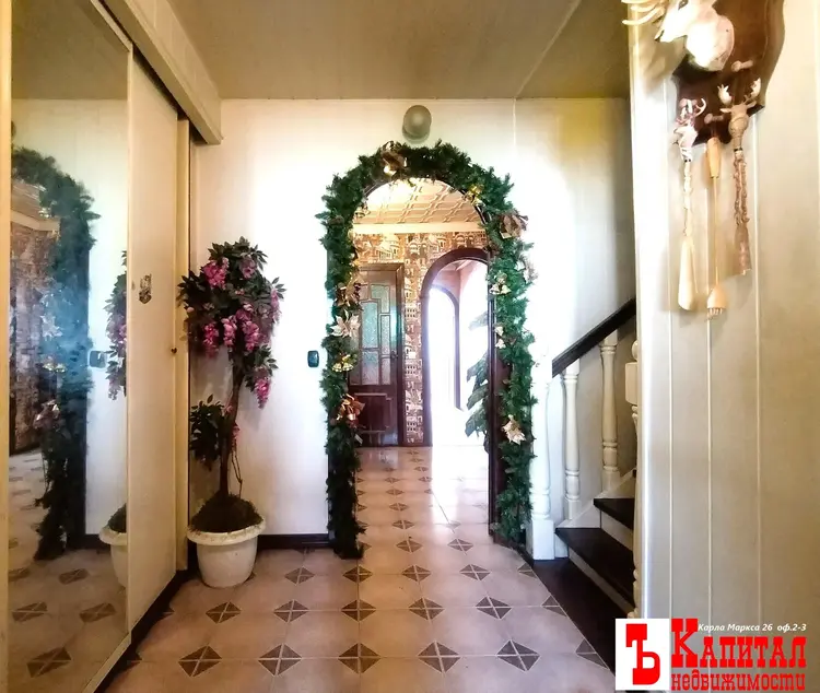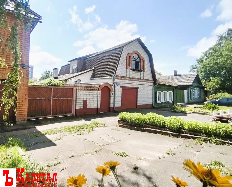 Дом бревенчатый, облицован кирпичом. Фундамент дома - кирпичный. Материал крыши - волнистый шифер. Встроенный гараж (18.7 м2) с ямой. Имеется мастерская комната 11.5 м2.