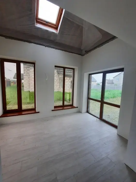 Основной первый этаж: Просторная кухня-гостиная (54.2 м.кв) и три изолированные жилые комнаты (16.3 / 15.6 / 12.3 м.кв). Чистовая отделка: на полу уложена плитка, стены выровнены под финиш, установлены окна ПВХ.