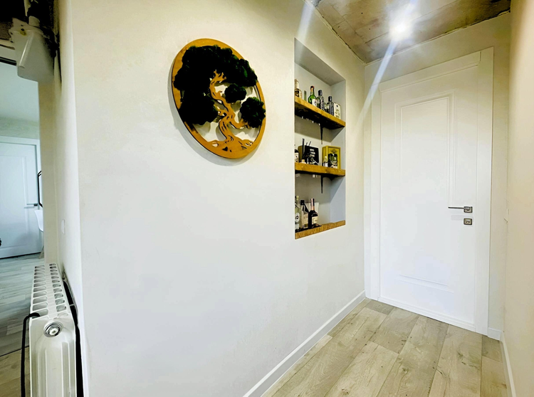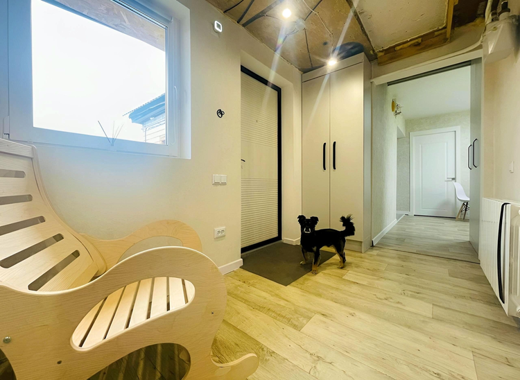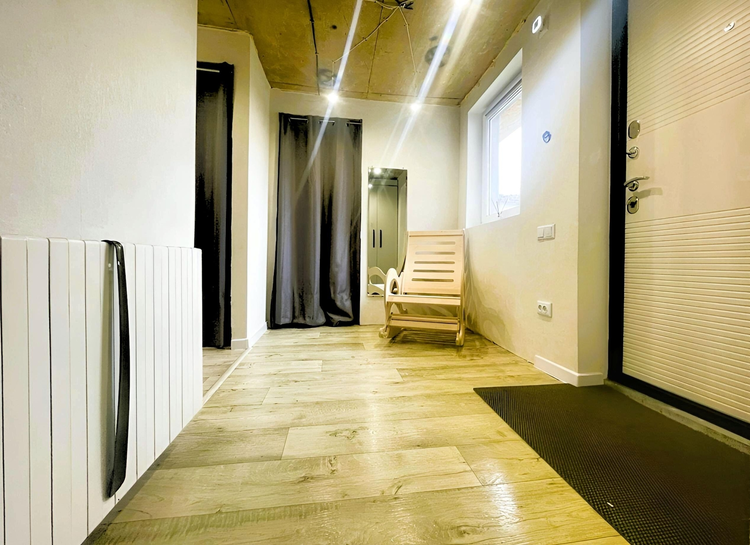 Комфортная зона прихожей. Отделка дома выполнена в спокойных нейтральных тонах. Напольное покрытие: плитка/ ламинат/ линолеум. Стены оклеены обоями. Потолки - натяжные (осталось доделать в нескольких помещениях).