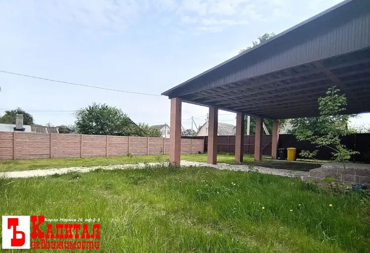 Ровный участок 7.2 соток. Капитальный большой навес для Вашего авто. Удобный подъезд к дому. Практичный проект. Ничего лишнего.