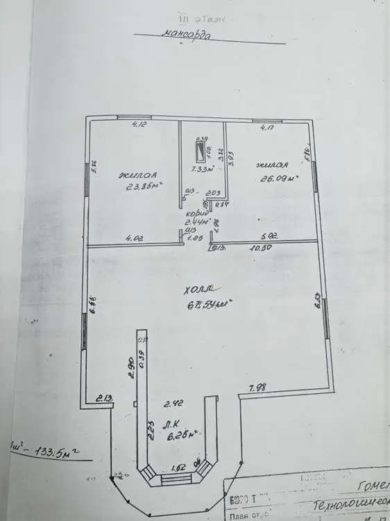 Третий этаж представлен холлом площадью 67,5 м.кв. и двумя жилыми комнатами площадью 26 и 23 м.кв.