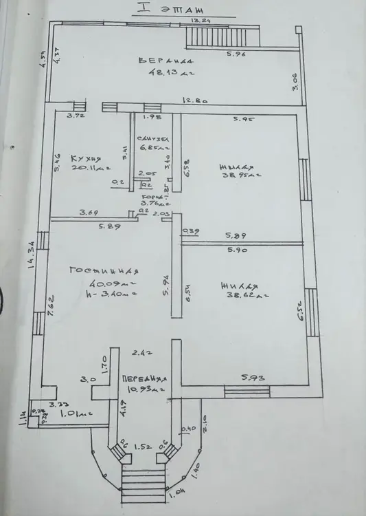 Первый этаж включает гостиную площадью 40 м.кв., две жилые комнаты по 39 м.кв. каждая, кухню 20 м.кв., санузел и веранду площадью 48 м.кв.