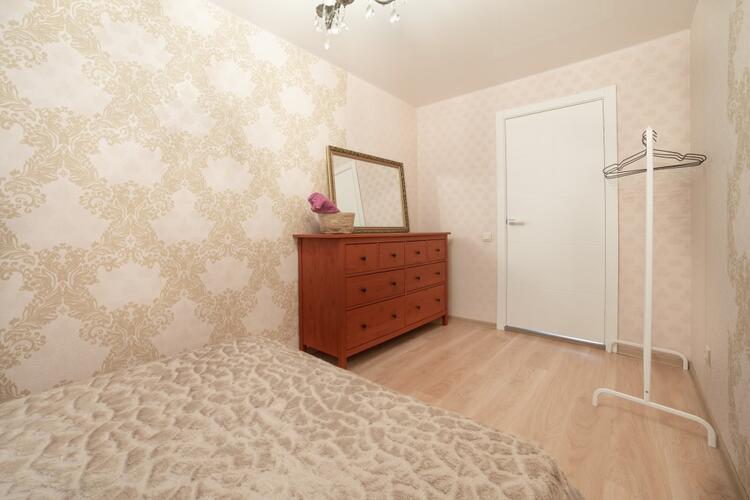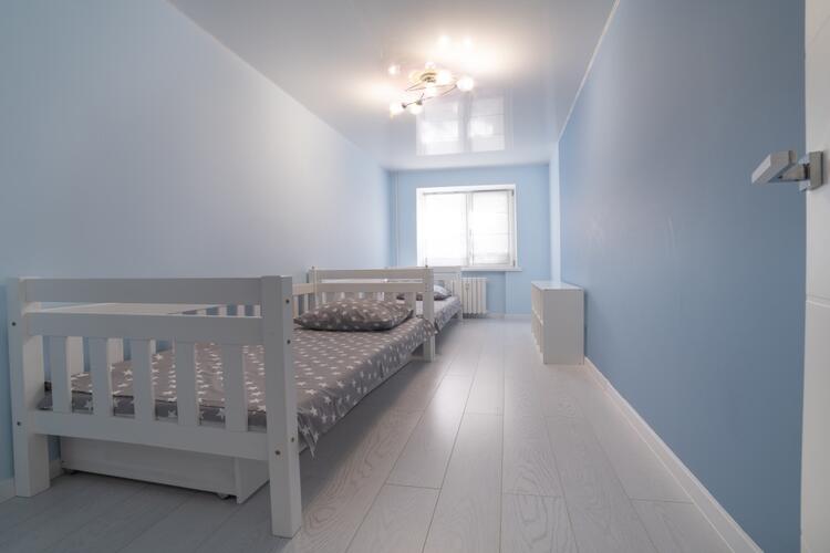 1 двухспальная кровать и 2 односпальные кровати с ортопедическими матрацами, двухспальный диван. Две раздельные комнаты с дверями.