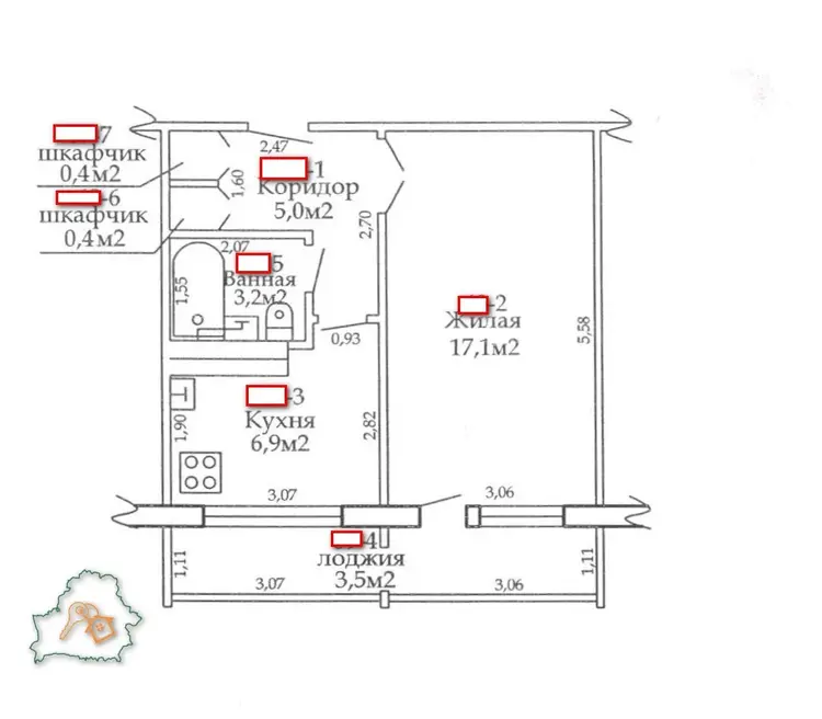 Общая площадь 33,0 м.кв., жилая 17,1 м. кв., кухня 6,9 м.кв.