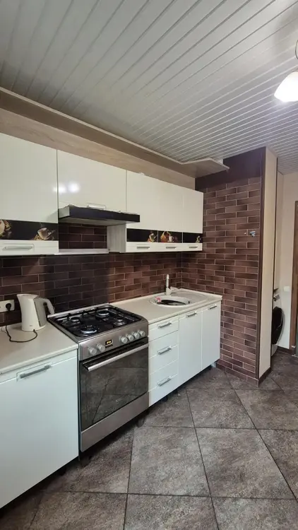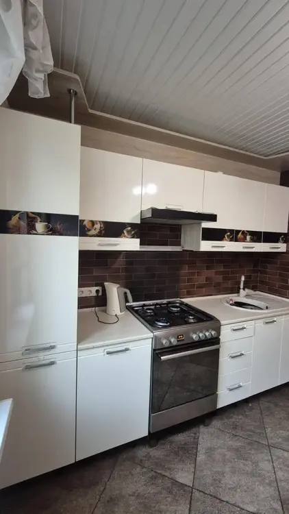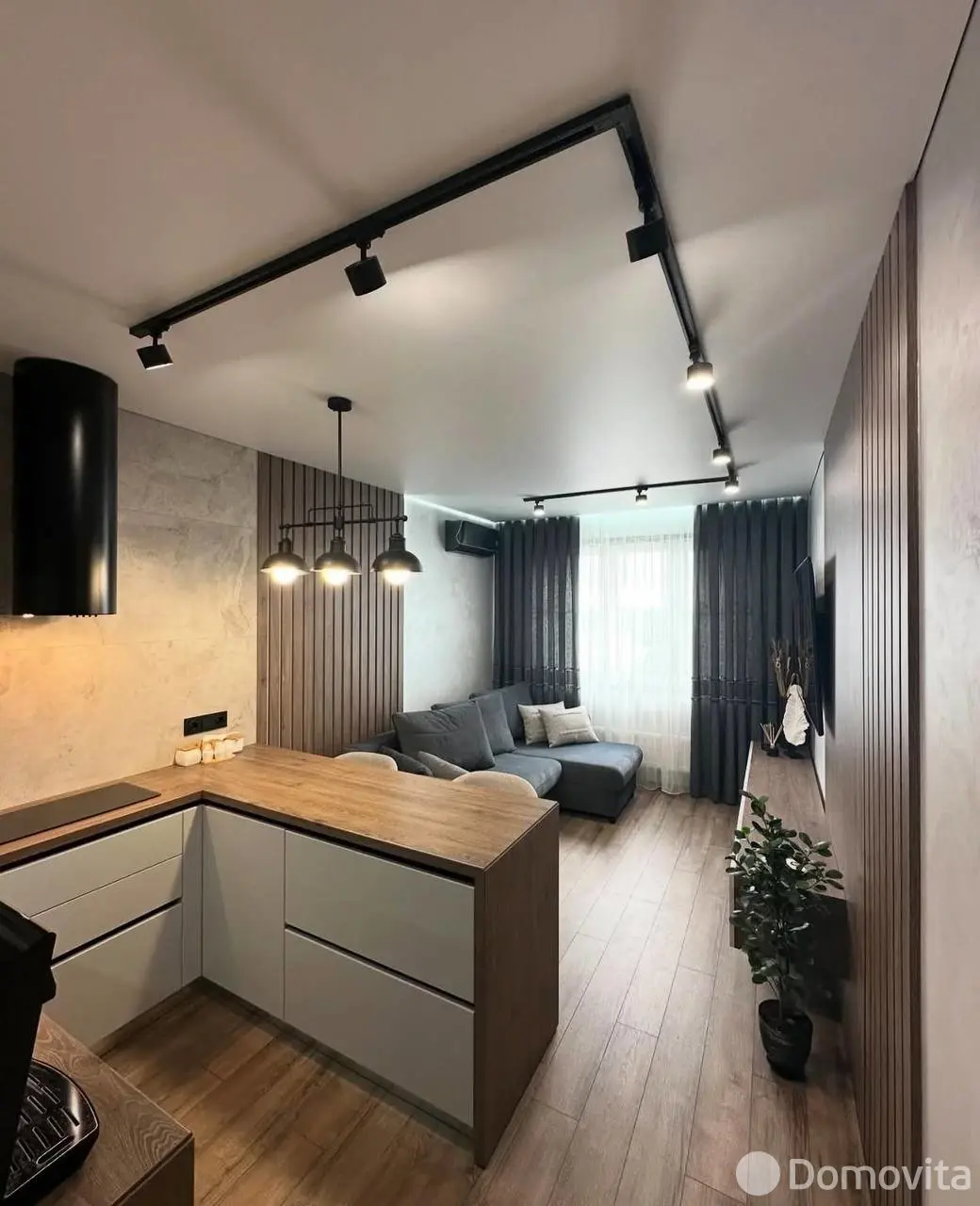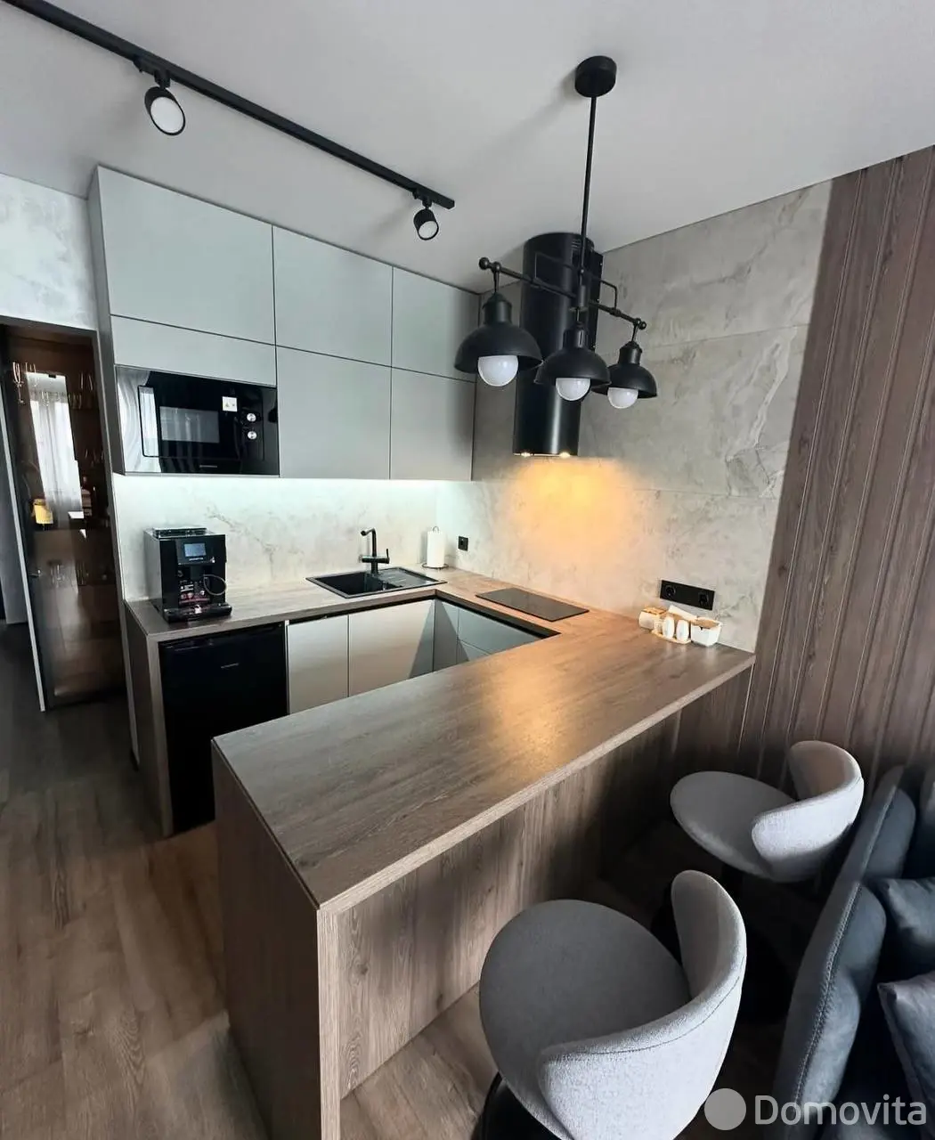 - Кухня оборудована встроенной техникой и имеет современный дизайн с барной стойкой.