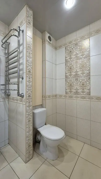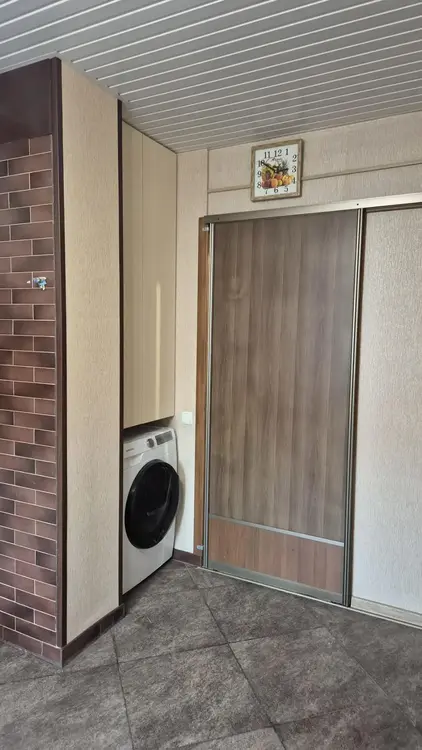 - Санузел отделан плиткой с имитацией камня, установлена современная сантехника, стиральная машина встроена в мебель.
