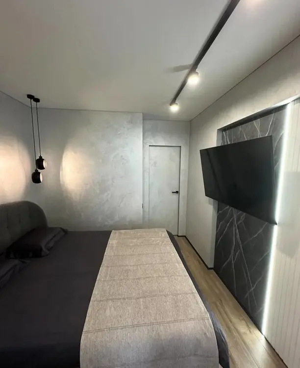 - Потолок — натяжной с встроенной точечной и линейной LED-подсветкой.