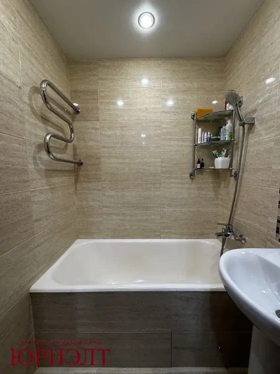Раздельный санузел: ванная комната отделана плиткой в теплых бежевых тонах, установлена качественная сантехника.