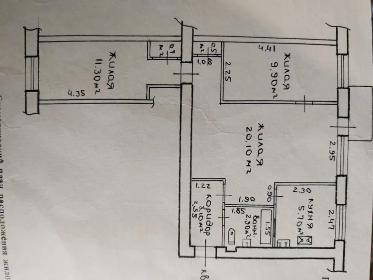 - Общая площадь: 54.2 кв.м. (жилая — 41.3 кв.м., кухня — 5.7 кв.м.);