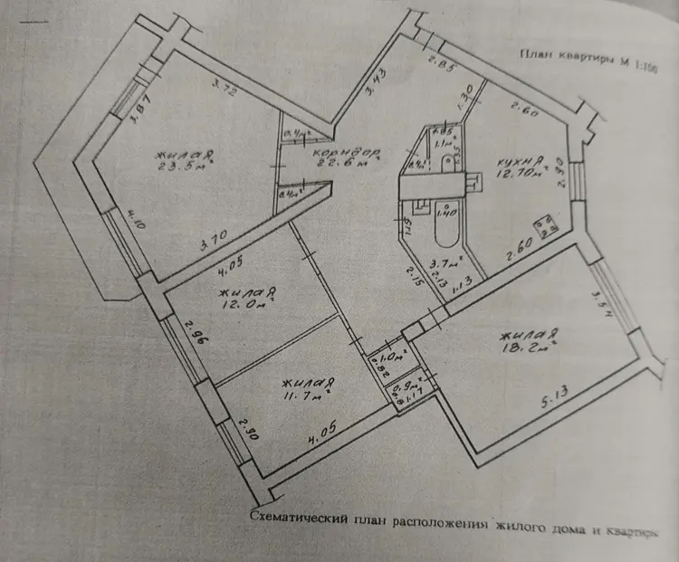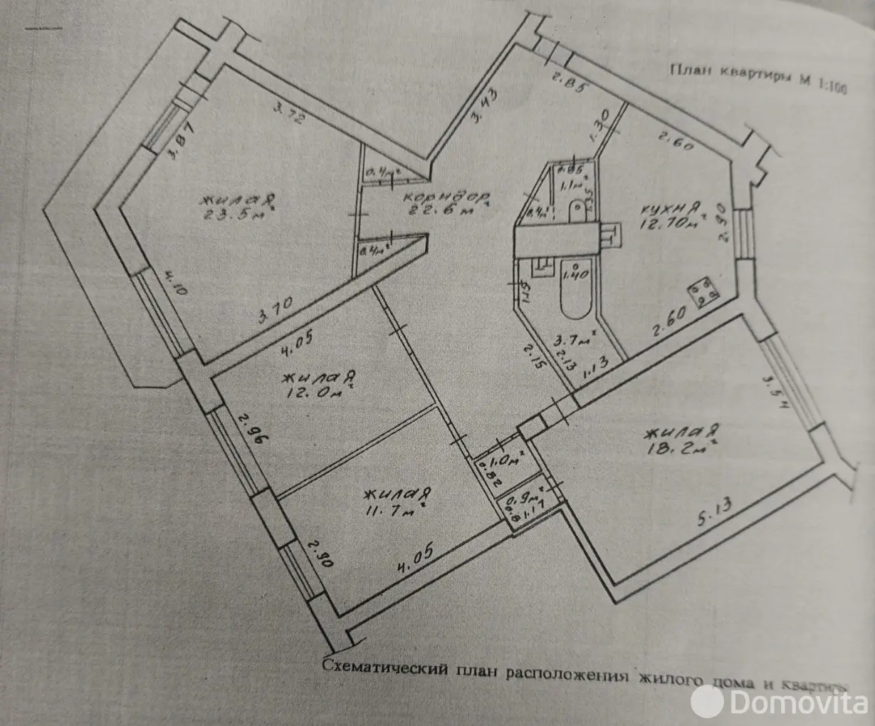 Квартира расположена на 4-м этаже 5-ти этажного кирпичного дома. Комнаты изолированные площадью 23,5;12;11,7 и 18,2 кв.м. Окна деревянные, входная металлическая дверь, на полу паркет, линолеум. Квартира не угловая.