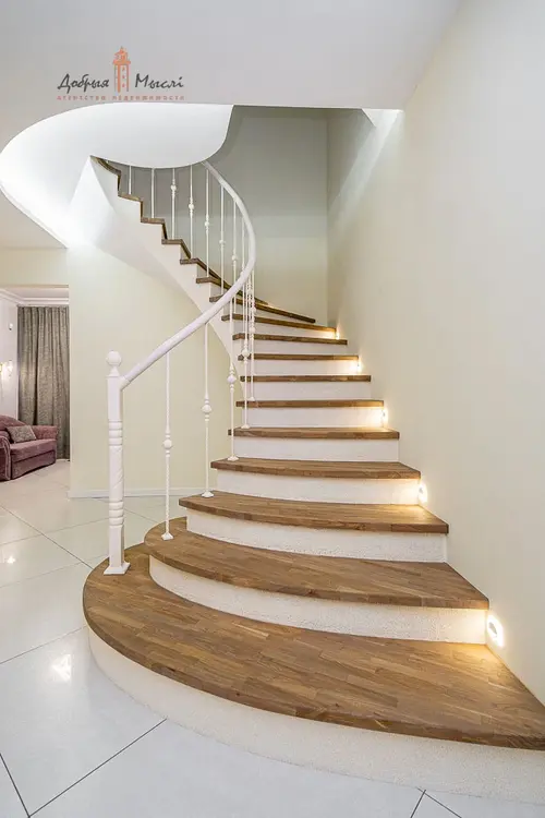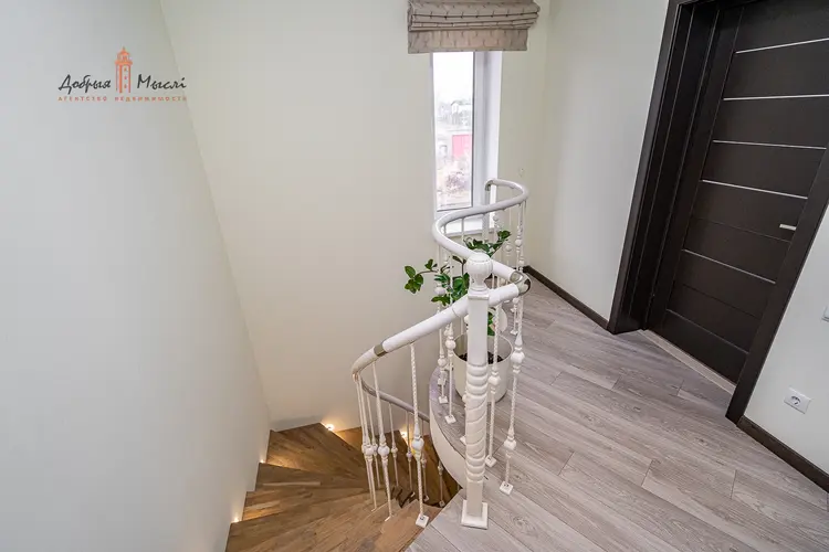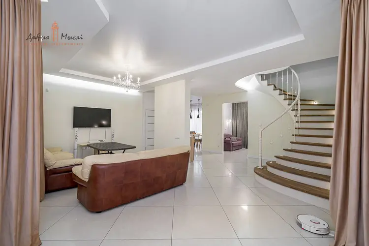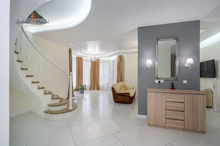 Многоуровневые потолки со шторами блэкаут. Стильная лестница с подсветкой ступеней. Гардеробная на первом и втором этаже. Два балкона.