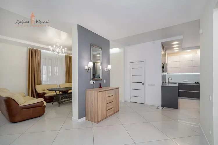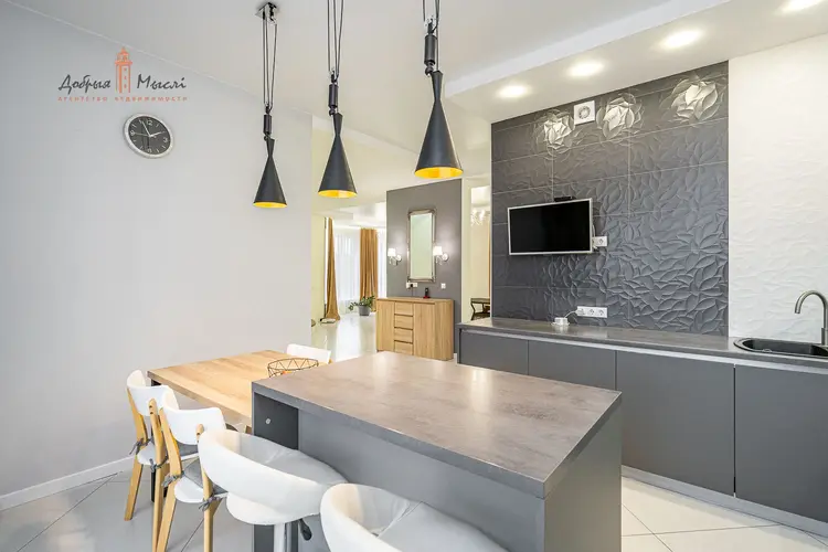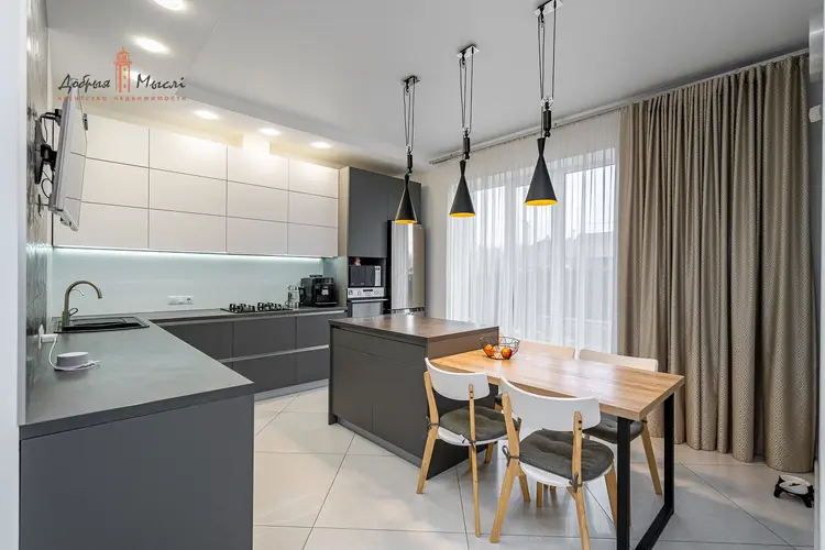 Встроенная кухня с посудомоечной машиной Electrolux, варочной поверхностью Simfer, духовым шкафом и микроволновой печью Samsung, холодильником LG, все дверцы и ящики с доводчиками и качественной фурнитурой фирмы Hettich. Стильные подвесные светильники.
