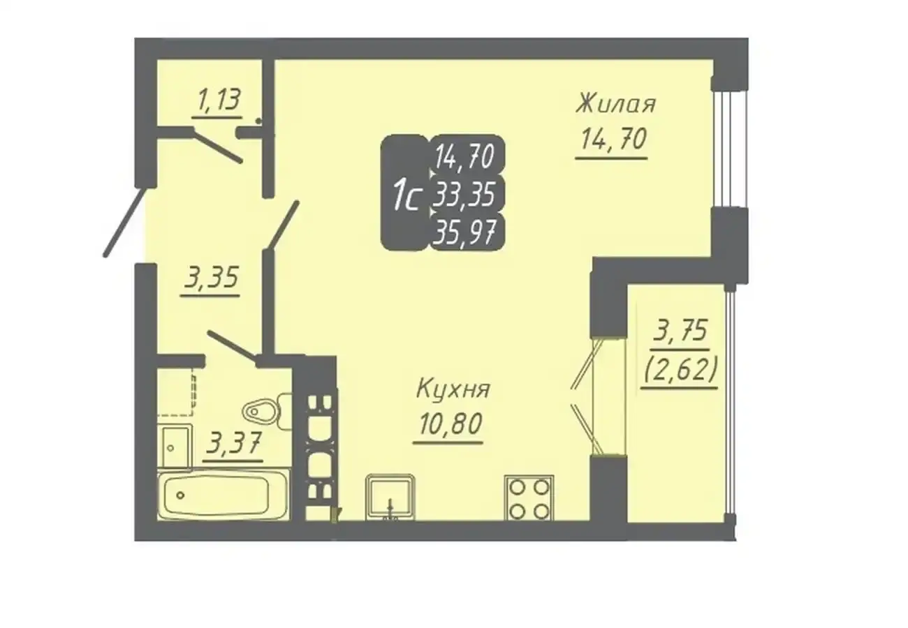 Квартиры студии площадью: - 32.15 м2; 35.97 м2; 39.67 м2.
