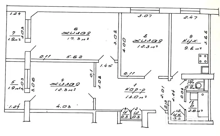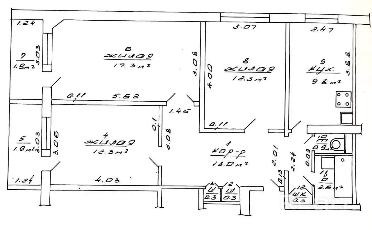 Площадь: общая — 72,9 кв.м, жилая — 59,1 кв.м. Кухня: 9,8 кв.м. Комнаты: 17,3 кв.м (с лоджией 1,9 кв.м), 12,3 кв.м (с лоджией 1,9 кв.м) и 12,3 кв.м.
