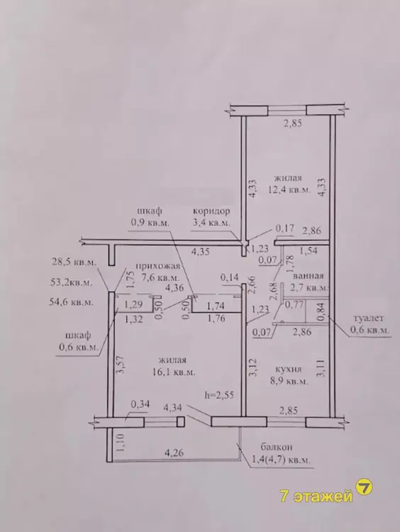 Площадь по СНБ: 54.6 квадратных метров.