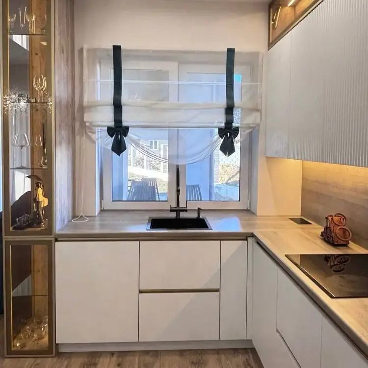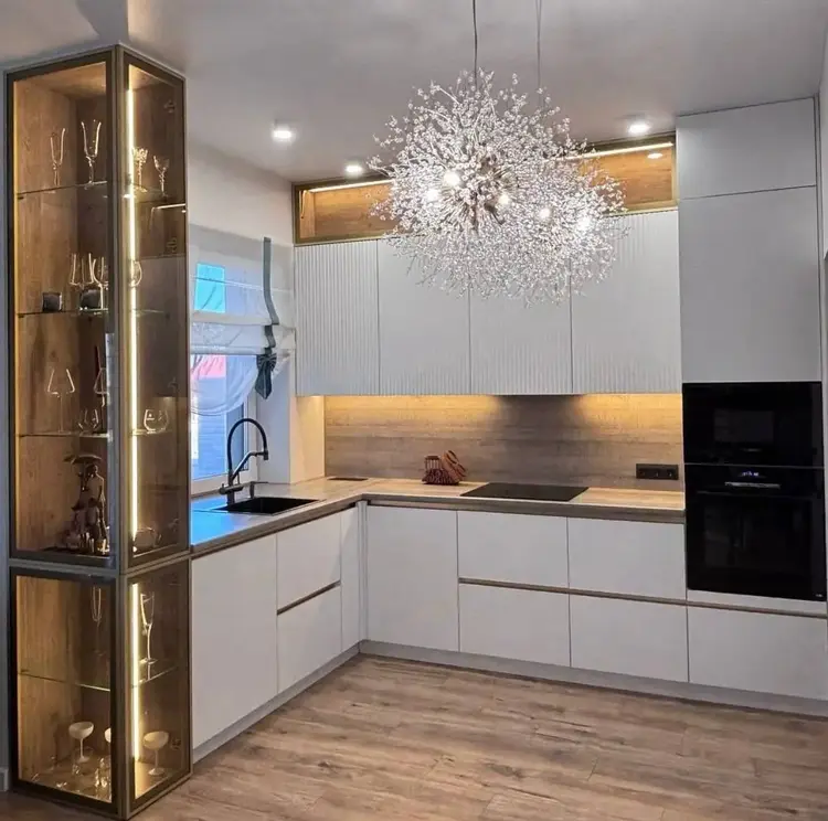 Кухня - фасад крашеный фрезерованный МДФ +акрил , фурнитура Blum, столешница ЗОВ, ДСП - Egger ,витрины - стекло феникс графит в рамке цвета золото браш .