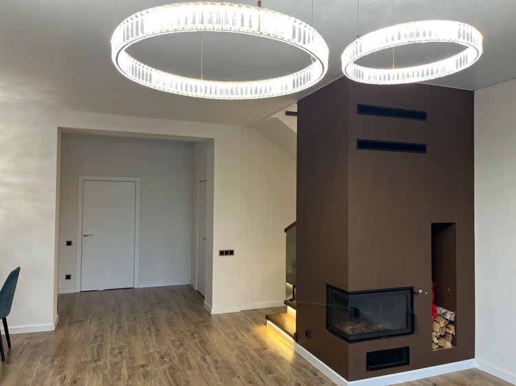 Хрустальная люстра в гостиной производство Польша , контурная подсветка натяжного потолка , Кухня люстры - одуванчик , Различная подсветка кухни , в том числе внутри шкафчиков, подсветка ступеней лестницы,установлены светильники бра на лестничном марше , в детских комнатах установлены световые линии и ночники , коридор , прихожая, котельная и с/у установлены галогеновые светильники. Выведена проводка на подсветку участка, видеодомофон, автоматику откатных ворот и калитки + зарядное для электромобиля .