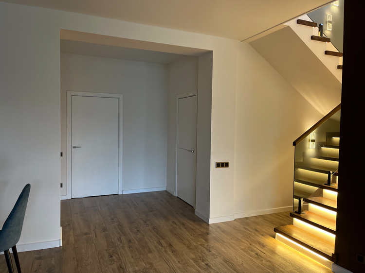 Лестница- монолитная из бетона , установлено ограждение из тонированного стекла триплекс 10мм с дубовым поручнем , ступени из дуба с подсветкой