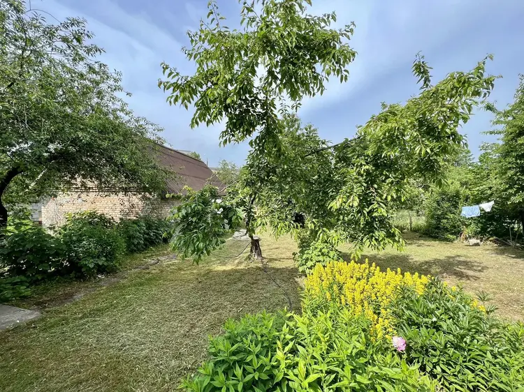 Участок 25 соток, на праве собственности ПНВ, ухоженный, обрабатывается, огорожен со всех сторон сеткой с воротами для авто, имеются плодовые деревья и кустарники. На участке есть кирпичная хозпостройка и гараж из блоков. Так же имеется большой подвал в пристройке.