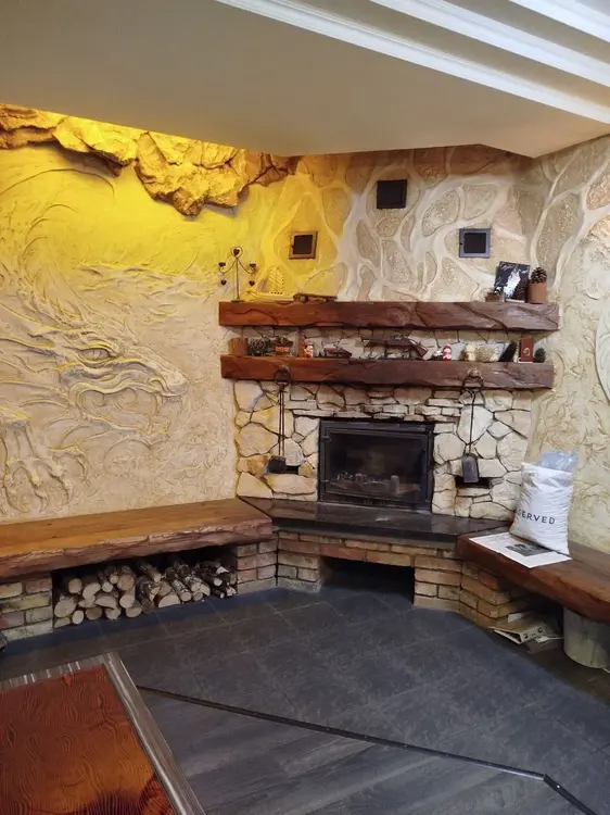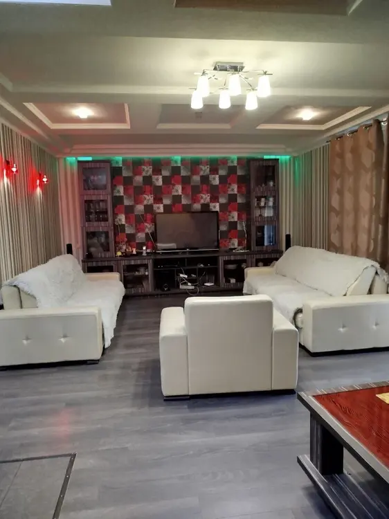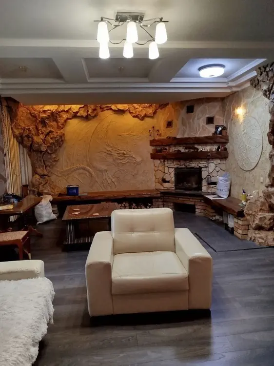 На первом этаже дома расположена просторная кухня - 22,3 м2, гостиная - 35,3м2 с выходом на террасу, санузел совмещённый - 5,3 м2 и гардеробная. В гостиной комнате установлен действующий камин. Пол - ламинат, плитка на кухне и в санузле.
